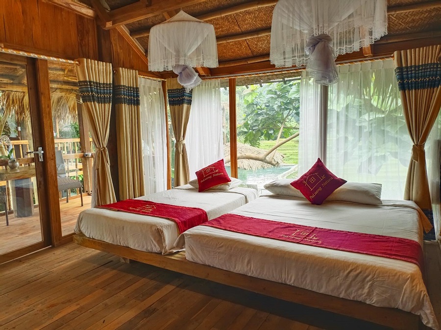 Đặt phòng Pù Luông có bể bơi vô cực check-in đẹp này du khách có thể lựa chọn các loại phòng như: Phòng giường đôi view nhìn ra núi, phòng gia đình có hàng hiên, giường đơn trong phòng ngủ tập thể, phòng ngủ tập thể cho nhóm đông người và phòng view nhìn ra núi.
