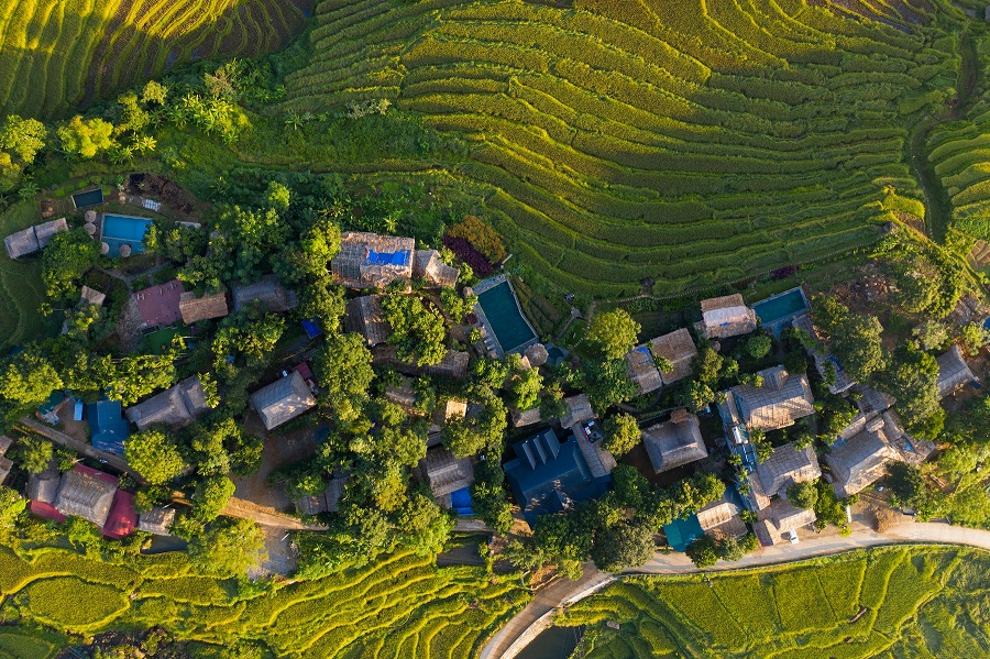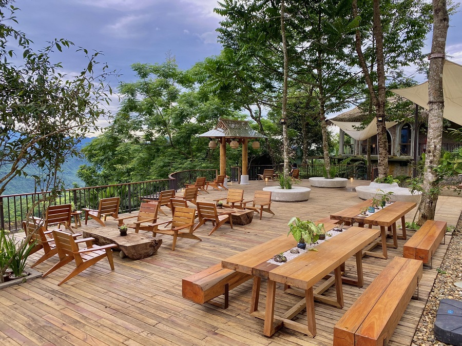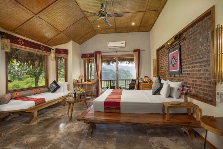 Các khu nhà được xây dựng theo phong cách nhà sàn, đồ đạc được làm bằng gỗ, bày biện tối giản, mang tông màu, trắng ấm cúng nhưng rất đầy đủ tiện nghi như wifi miễn phí, điều hòa, dọn phòng hàng ngày, có ban công cùng cà phê và trà có sẵn để du khách có thể ngồi nhâm nhi ly cà phê, ngắm nhìn quang cảnh núi non, ruộng bậc thang.