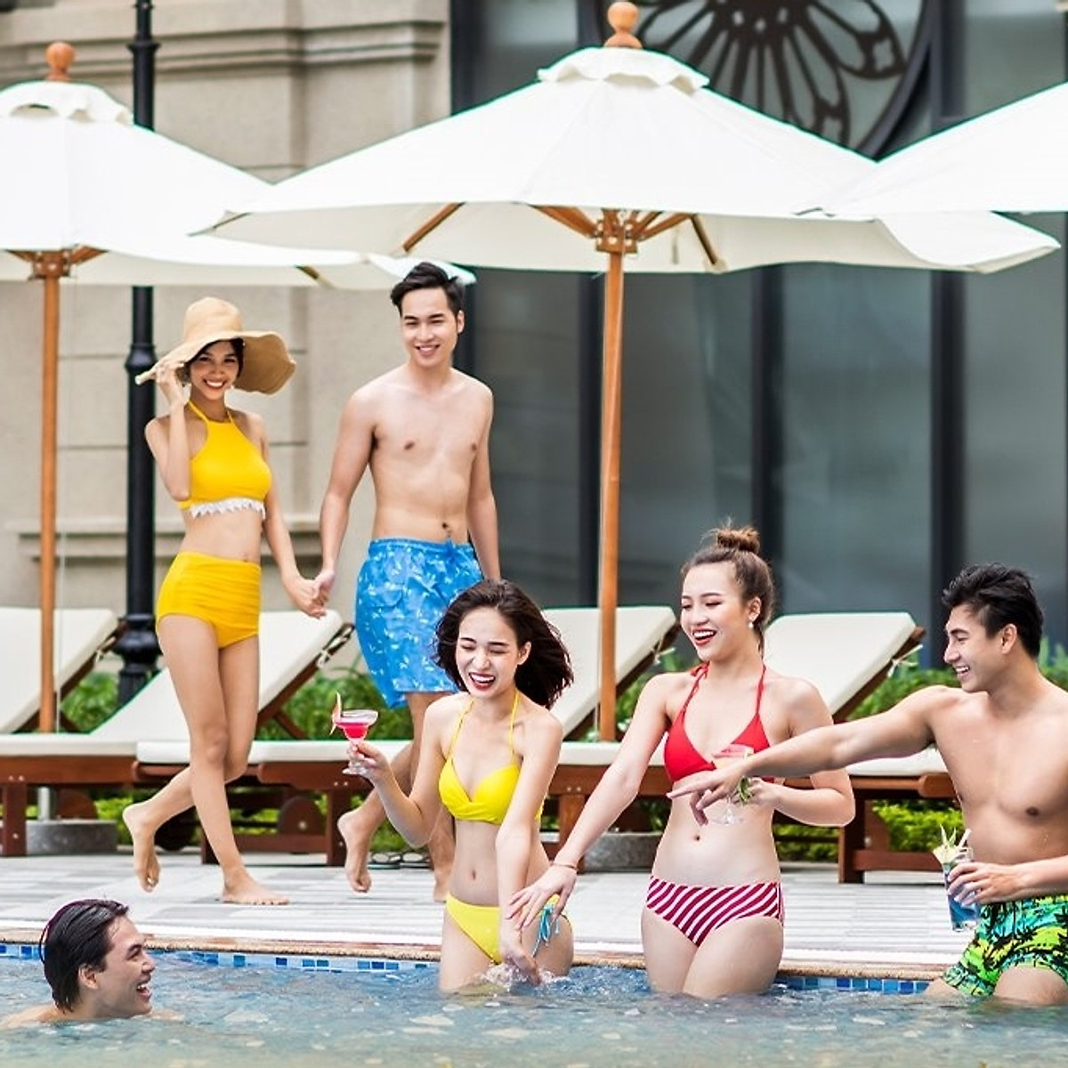Khu nghỉ dưỡng có hồ bơi ngoài trời rộng khoảng 800m2 với độ sâu khoảng 1.2m. Ngoài ra khu nghỉ dưỡng còn thiết kế thêm bể bơi nhỏ dành riêng cho trẻ em nằm chung hồ bơi người lớn với độ sâu an toàn khoảng 0.6m.